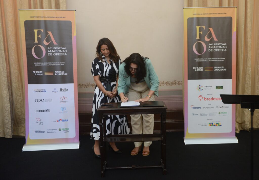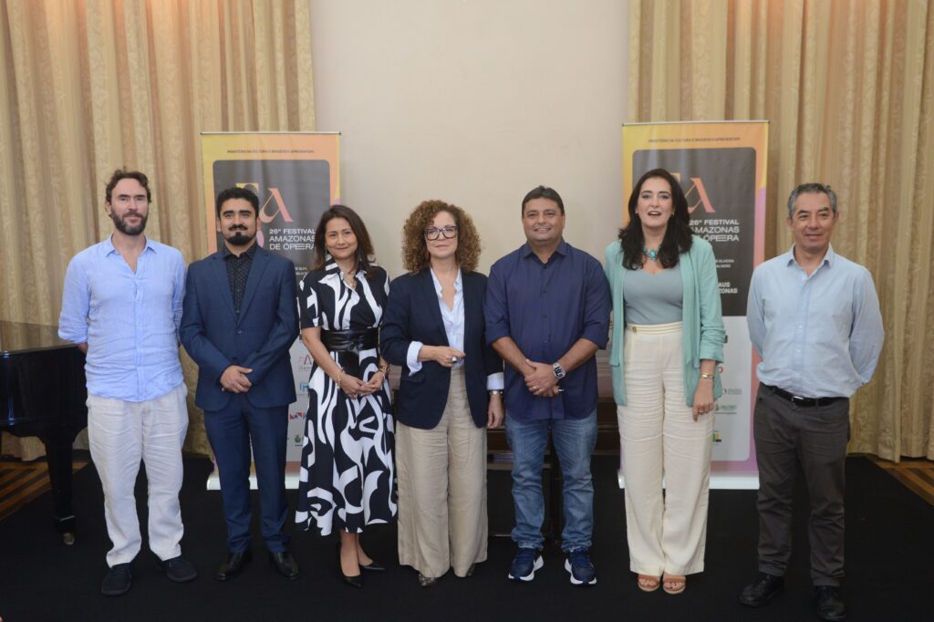 De izquierda a derecha: Pedro Salazar (Director de la Fundación Compañía Estable), Nicolás Vásquez (Director de la Fundación Lírica Disidente), Cristina Guevara de Frint (Fundadora y CEO de Munay Group), Secretaria Úrsula Vidal (Secretaria de Cultura del Estado de Pará), Secretario Caio André (Secretario de Cultura y Economía Creativa del Estado de Amazonas), Flávia Furtado (Directora Presidenta del FFAO y Directora Ejecutiva del FAO), Ricardo Jaramillo (Director Artístico y Musical de la Orquesta Nueva Filarmonía).